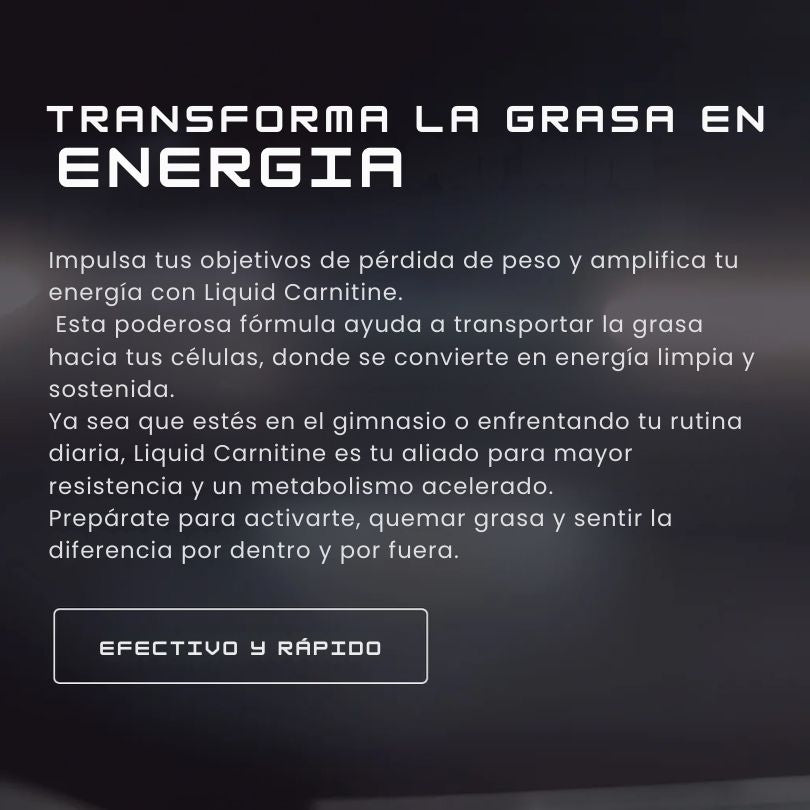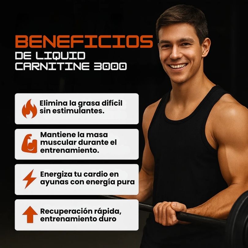 Una fórmula clínica de 3000 mg de L-Carnitina líquida, diseñada para potenciar tu metabolismo, mejorar tu resistencia y acelerar la recuperación muscular, todo sin estimulantes.