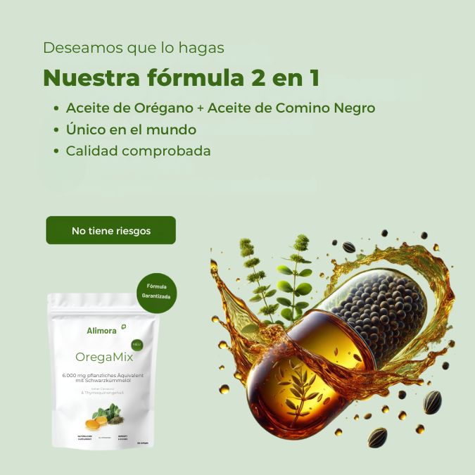 Ingredientes activos: Aceite de orégano (con alto contenido de carvacrol) + aceite de comino negro (rico en timonquinona)